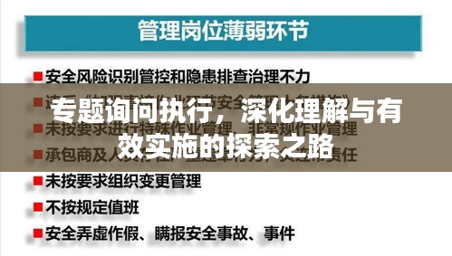 在现代社会,专题询问执行已经成为各个领域不可或缺的一环,无论是企业管理、政府决策还是学术研究,专题询问执行都扮演着至关重要的角色,本文将从专题询问执行的概念入手,逐步探讨其重要性、实施步骤、挑战及应对策略,以期为读者提供全面而深入的理解。