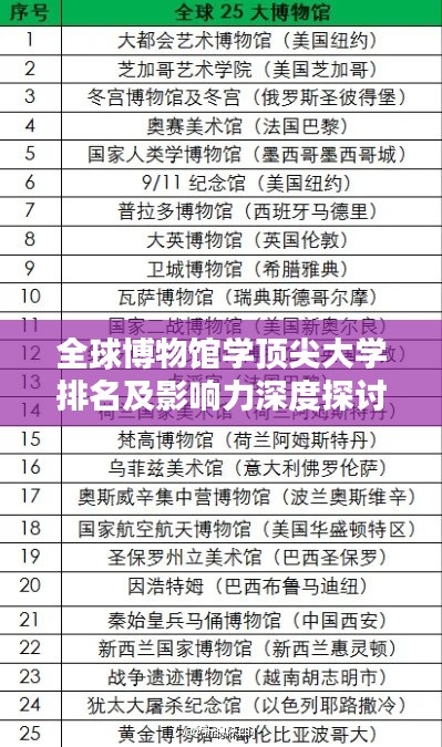 博物馆学作为一门跨学科的学问,涵盖了历史、艺术、文化、考古等多个领域,随着全球范围内对文化遗产的重视,博物馆学逐渐成为热门专业,越来越多的学子选择到世界各地的大学深造,本文将围绕“博物馆学世界大学排名”这一主题展开讨论,探究各大学在此领域的实力与影响力。