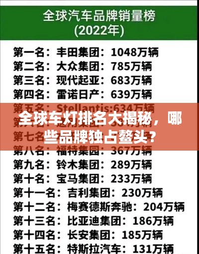 车灯是汽车的眼睛,是驾驶安全的重要保障,随着汽车行业的发展,车灯技术也在不断进步,各种品牌的车灯琳琅满目,下面我们就来了解一下世界车灯排名,看看哪些品牌的车灯在性能、质量、创新等方面表现出色,赢得了消费者的青睐。