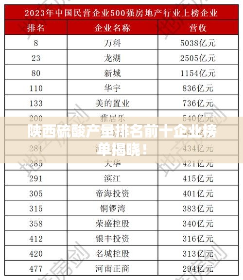 是陕西硫酸产量排名前十名的企业,这些企业在硫酸产业中具有较高的影响力和竞争力,为陕西省的经济发展做出了重要贡献,随着技术的不断进步和市场的不断变化,这些企业还需要不断提高自身的技术水平和创新能力,以适应市场的需求和变化,这些企业还需要注重环保和可持续发展,积极推进绿色生产,为陕西省的经济发展做出更大的贡献。