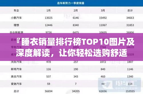 随着生活品质的提升,人们对于家居生活的舒适度要求越来越高,睡衣作为家居生活的重要组成部分,其选择亦显得至关重要,本文将为您呈现睡衣销量前十名的排名图片,并深入探讨其背后的市场趋势、产品特点以及消费者偏好。