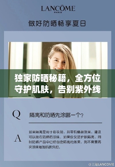 随着气温逐渐升高,阳光愈发灿烂,防晒成为了每个人关注的话题,紫外线对肌肤的伤害不容忽视,长期暴露在阳光下可能导致皮肤老化、色斑甚至皮肤癌,掌握一套独家防晒秘籍至关重要,本文将为你揭示全方位的防晒秘籍,助你有效抵御紫外线的侵害。