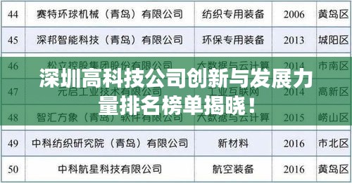 随着科技的日新月异,深圳这座充满活力的城市已经成为中国乃至全球的高科技产业重镇,众多高科技公司凭借创新精神和卓越实力,走在时代前沿,引领行业发展,本文将为您带来深圳高科技公司的排名,揭示这座城市的创新力量与发展速度。
