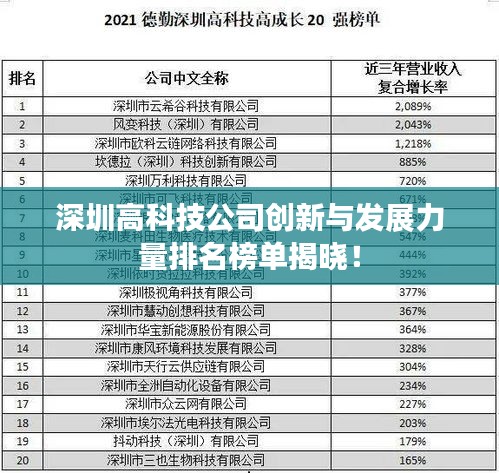 就是深圳高科技公司的排名,这些公司在各自的领域内均取得了显著的成就,为全球用户提供了优质的产品与服务,深圳的高科技产业之所以能取得如此骄人的成绩,离不开这座城市创新精神、开放态度和政府的大力支持,深圳的高科技产业将继续保持强劲的发展势头,为全球科技进步做出更大的贡献。