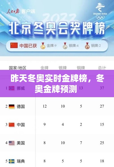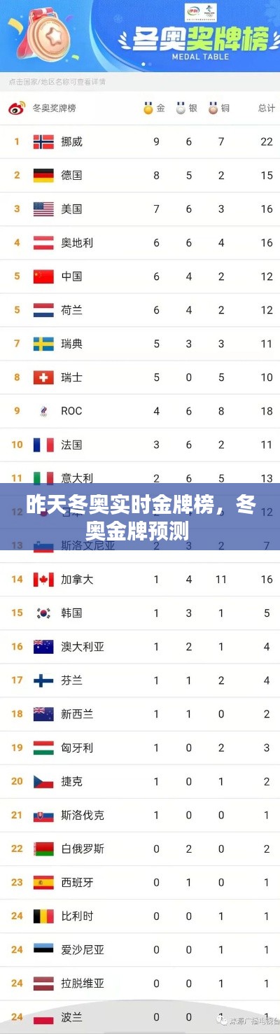 随着2022年北京冬奥会的顺利进行,各国运动员在各个项目中展开了激烈的角逐。在这场全球瞩目的体育盛事中,金牌榜的实时更新成为了众多观众关注的焦点。以下是截至昨天晚上的实时金牌榜情况,让我们一起回顾一下昨天的精彩瞬间。