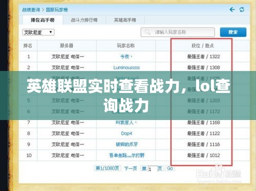 《英雄联盟》(League of Legends,简称LOL)作为全球最受欢迎的多人在线战斗竞技场游戏之一,其竞技性一直是玩家关注的焦点。在游戏中,玩家的实力往往决定了比赛的走向。因此,实时查看战力成为了许多玩家和职业选手的重要需求。本文将探讨《英雄联盟》实时查看战力的意义、方法以及其对游戏体验的影响。