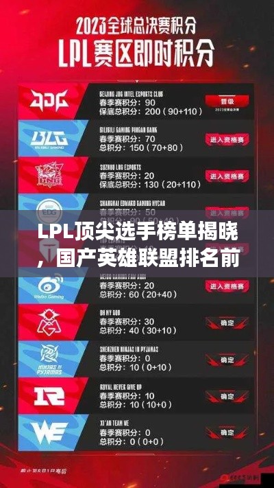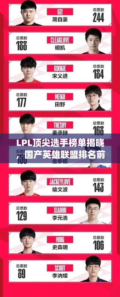 随着电子竞技的飞速发展,中国的英雄联盟(LPL)赛区已经成为全球最顶尖的电子竞技赛区之一,在这个充满竞争与挑战的赛场上,涌现出了一批又一批优秀的选手,本文将为您介绍国产LPL排名前十名的顶尖选手,他们用自己的实力和努力,赢得了无数荣誉和粉丝的喜爱。