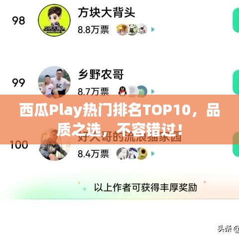 西瓜Play排名前十名的内容凭借其独特的魅力和优质的内容赢得了广大用户的喜爱和支持,无论是热门剧集、热门电影、综艺娱乐节目还是短视频内容、游戏直播、音乐榜单和知识分享课程,都能满足用户的各种需求,西瓜Play将继续努力,为广大用户提供更多优质内容,成为用户休闲娱乐的首选平台。