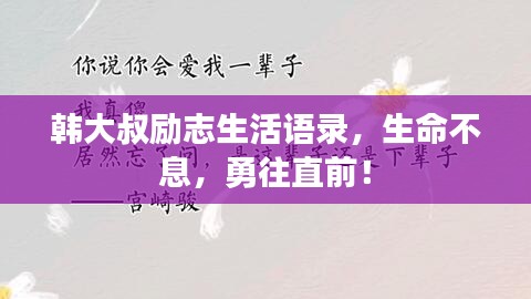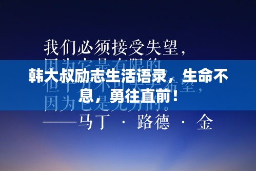 在这个充满挑战和机遇的时代,让我们携手共进,共同追求更加美好的生活,韩大叔的励志生活语录,将永远伴随着我们,成为我们前行的动力,让我们一起燃烧生命,勇往直前!