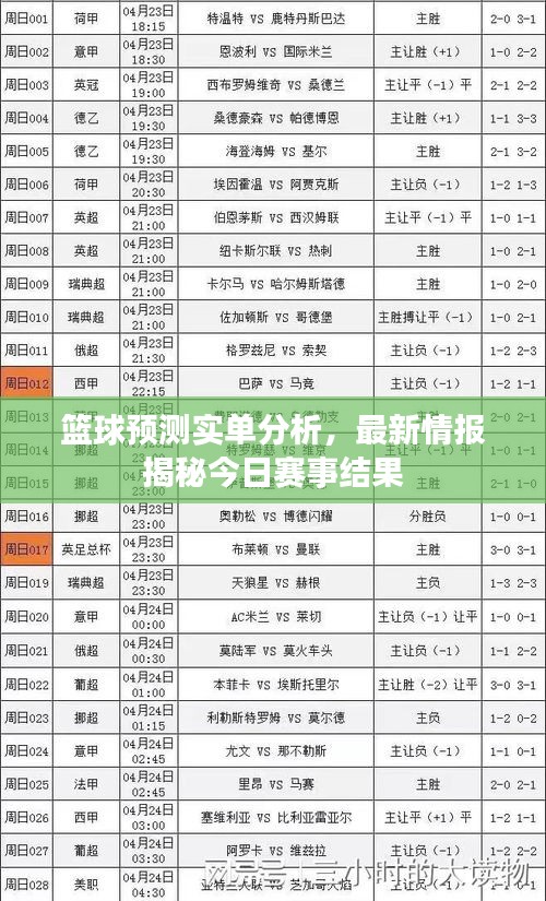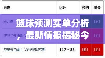 篮球运动在全球范围内拥有广泛的关注者和热爱者,每一场比赛都充满了激情与期待,随着科技的发展,越来越多的人开始关注实时的篮球预测,希望能够借此提高自己在篮球比赛中的胜算几率,本文将结合最新的篮球赛事动态,为大家带来今日篮球预测实单分析。