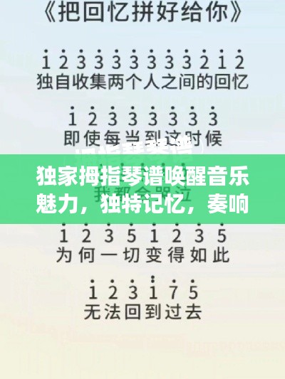 拇指琴独家记忆琴谱是一种独特的音乐体验,它不仅能让我们学习到拇指琴的演奏技巧,还能让我们在演奏过程中感受到音乐的魅力和力量,希望每一位热爱音乐的朋友都能尝试学习拇指琴,体验这种乐器的独特韵味,在音乐的道路上,让我们一起探索、一起成长。