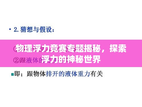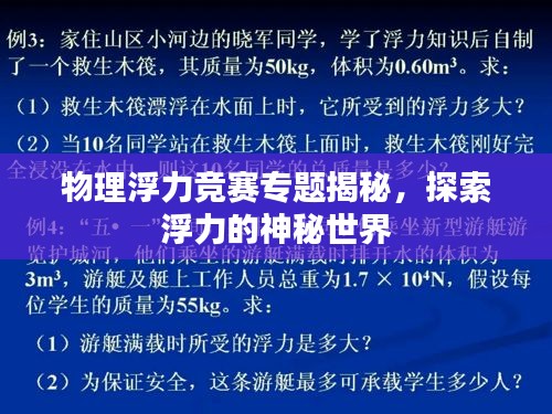在物理学中,浮力是一个引人入胜且充满挑战的领域,本文将围绕“物理浮力竞赛专题”展开,深入探讨浮力的基本原理、应用、相关竞赛内容以及实际生活中的例子,通过本文,读者将更好地理解和掌握浮力的知识,为参加物理浮力竞赛奠定坚实的基础。