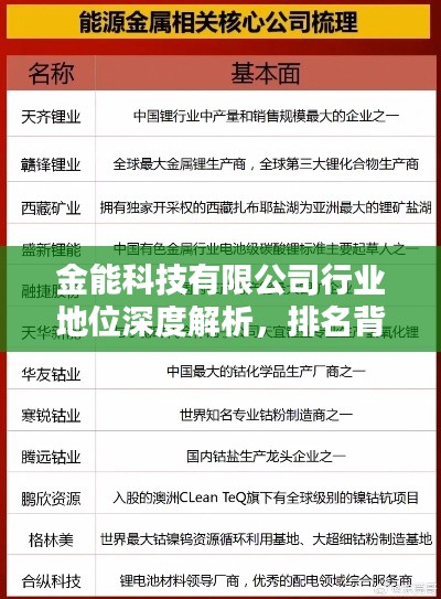 随着科技产业的飞速发展,金能科技有限公司凭借其卓越的技术实力和创新力在众多科技企业中脱颖而出,成为业界的佼佼者,本文将深入探讨金能科技有限公司的排名及其背后的原因。