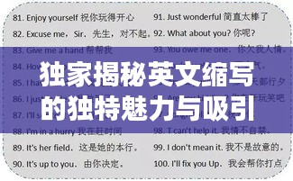 在这个时代,掌握并运用好英文缩写已经成为一种必备技能,而独家展示的英文缩写更是这一技能中的佼佼者,它以其独特的魅力吸引着人们的目光,为我们的生活增添了一抹亮色。